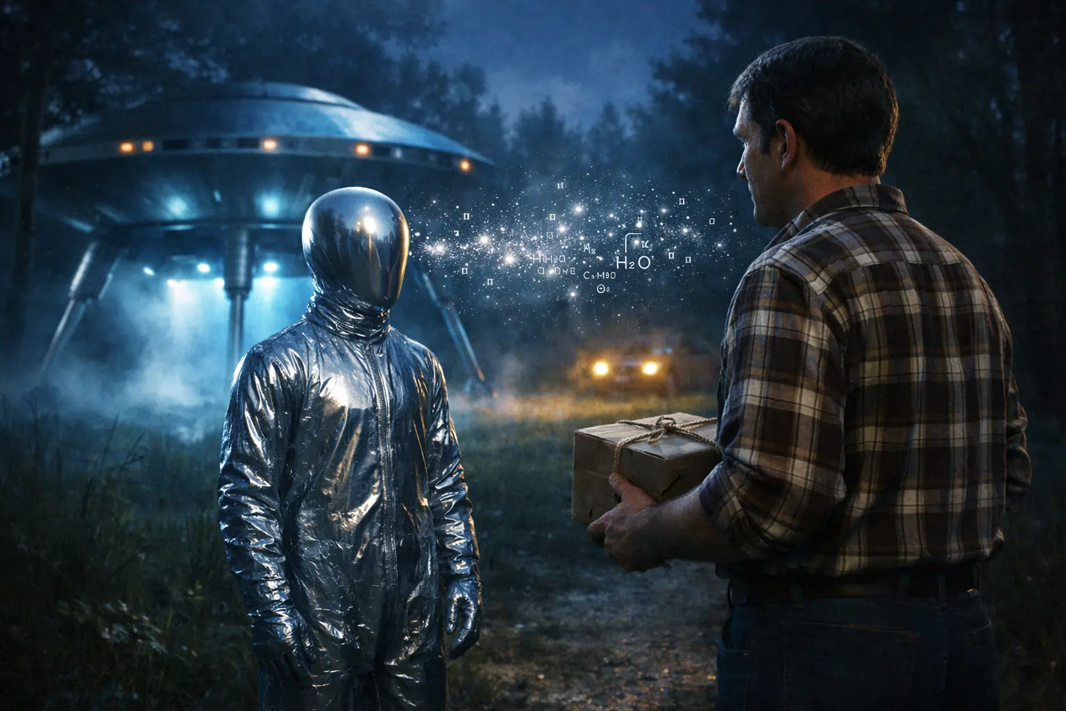 Biće je uzelo paket i odnijelo ga u letjelicu prečnika oko 12 metara koja je stajala na tri stajne noge u obližnjem polju.