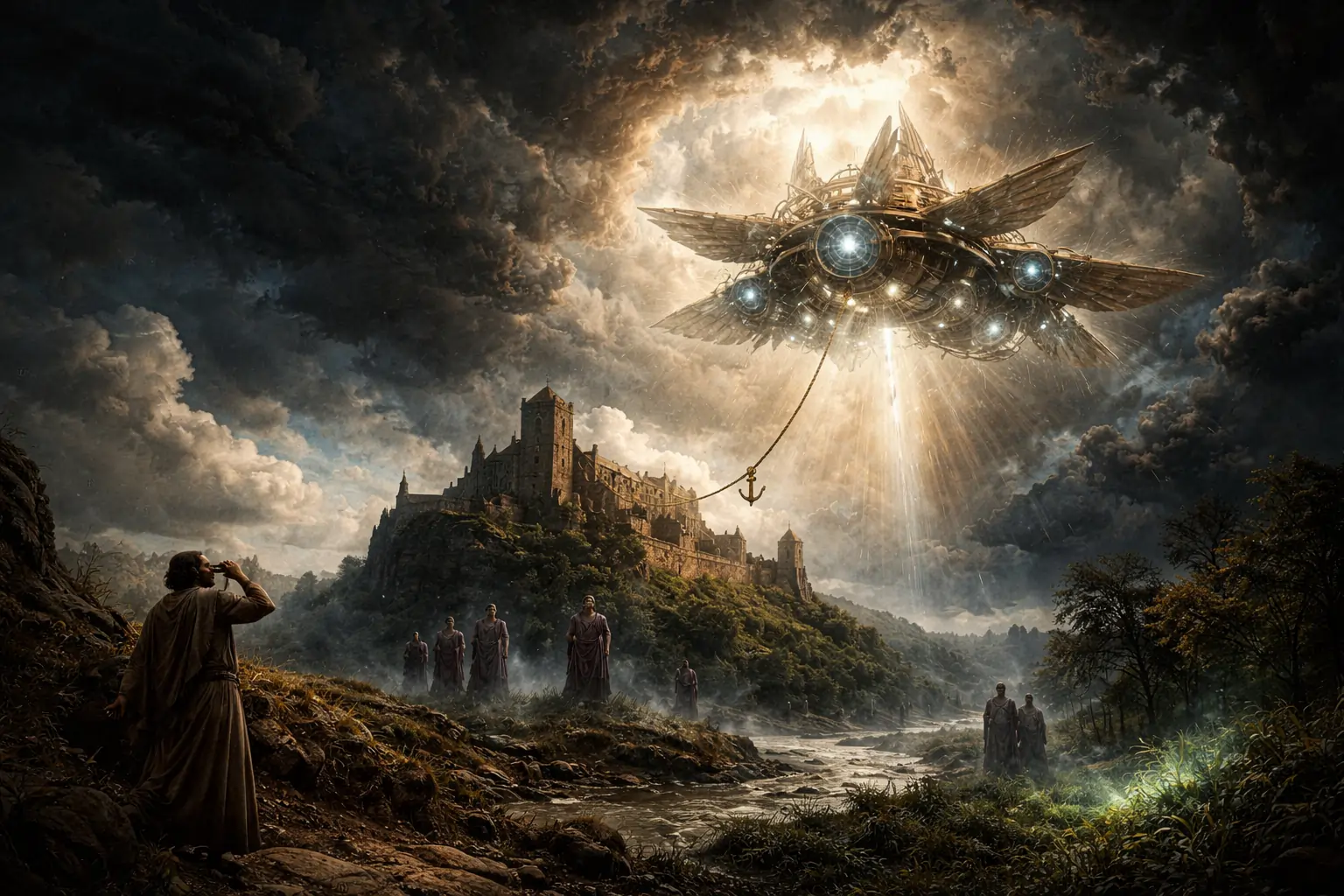 Vjernici su izasli van i ugledali brod kako pluta iznad njih. Jedan od članova nebeske posade skočio je s broda i “zaronio” kroz zrak prema sidru, praveći pokrete rukama kao da pliva.
